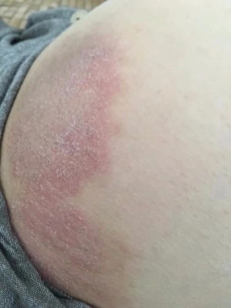 7月23日下午時刻潘同學用LINE傳來一張當天拍的照片(如圖一),患處位置在大腿上臀部下方處,患處面積大,除了明顯地呈現苔蘚化之外,顏色呈現黑褐色、深褐色、褐色及正發炎的紅色,外加長期乾燥搔抓後的脫屑。 而以上依照片呈現的皮膚障壁完全受損嚴重,通透性極大化,初步認定是長時間因癢而搔抓而面積擴大,也因長期未治癒而呈現皮膚表層外觀的苔蘚化。