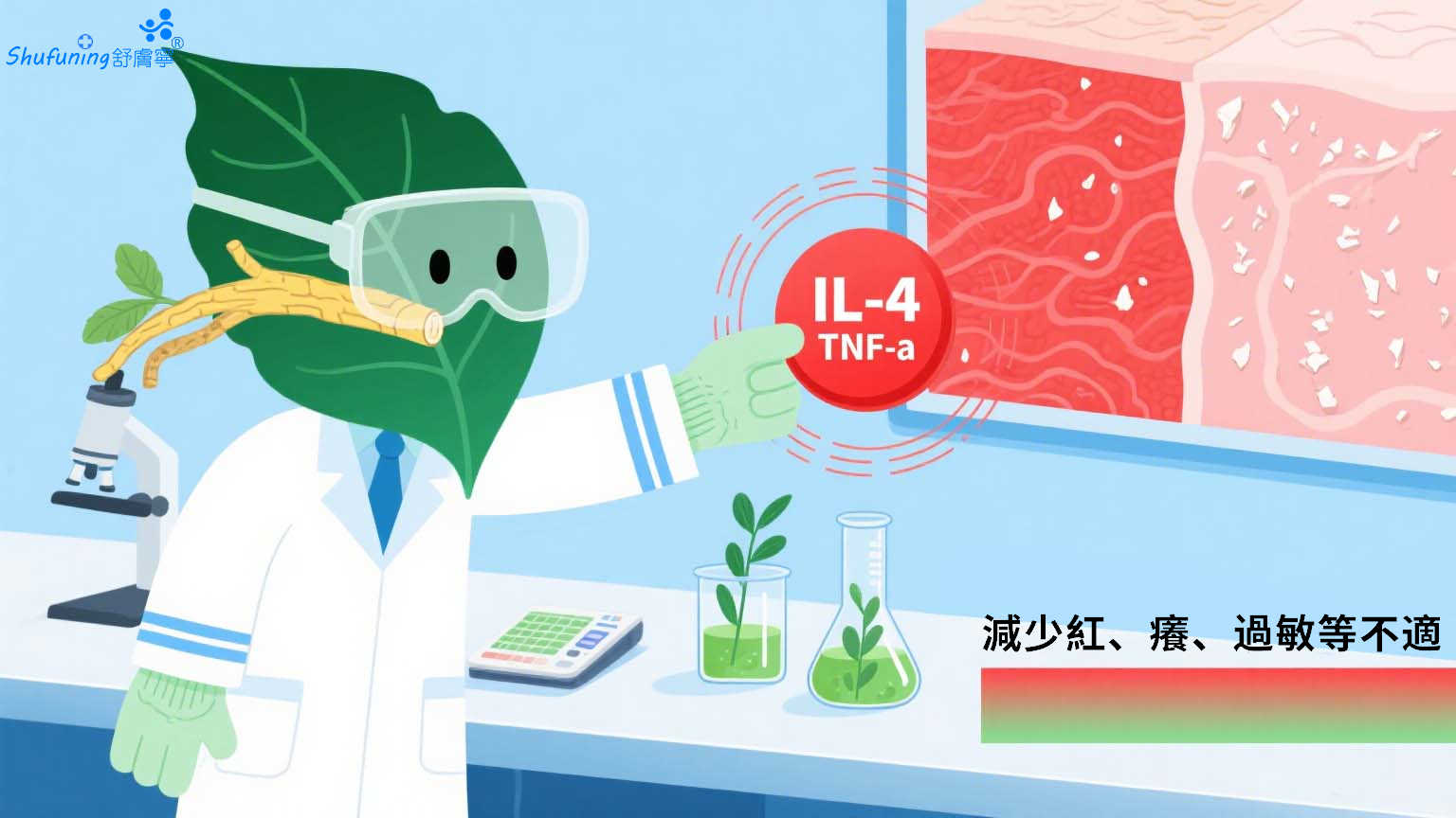 調控免疫信號通路:通過抑制過量炎症因子(如 IL-4、TNF-α)的釋放,減弱免疫系統的過度反應,從源頭緩解皮膚紅腫、瘙癢、脫屑等炎症症狀。
